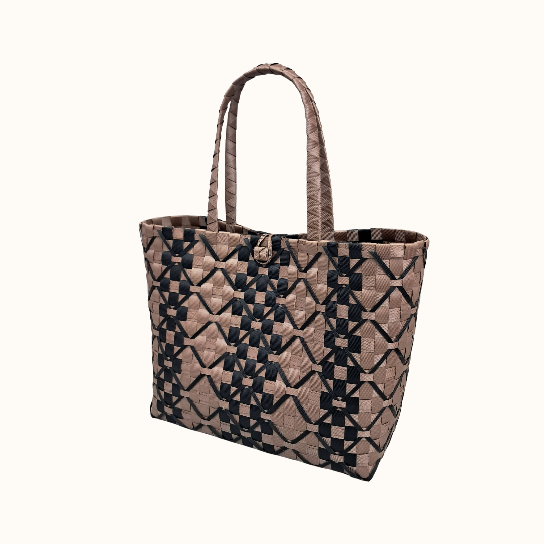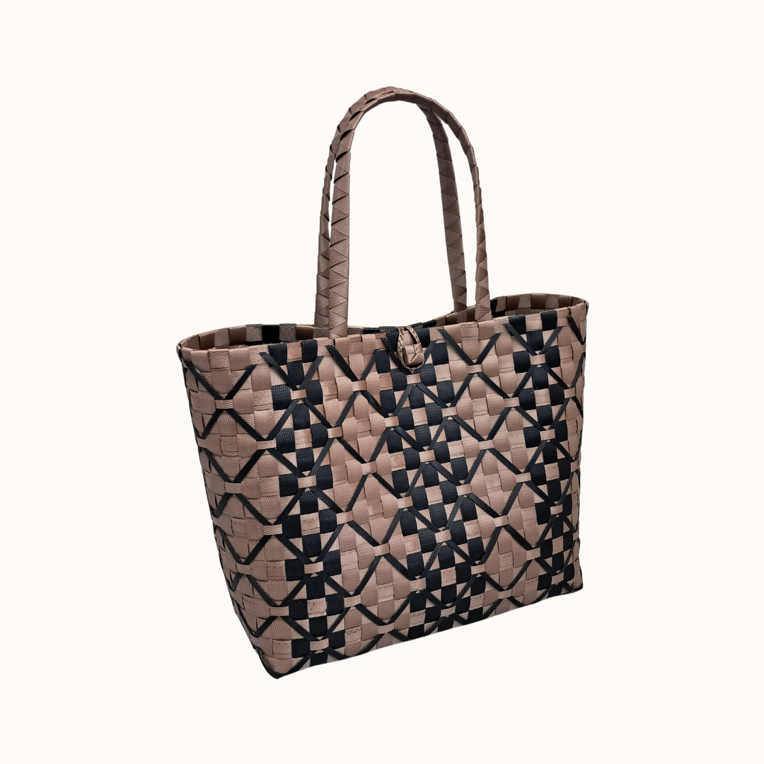 Lunta carries the quiet strength of the earth—woven by hand in muted brown and black, its geometric pattern feels both grounded and refined. Designed for days that begin at the market and end at a seaside café, this tote holds your essentials with a loop-and-button closure that feels both secure and intentional. Run your fingers along its textured weave and you’ll feel the rhythm of tradition reimagined for modern wanderers.