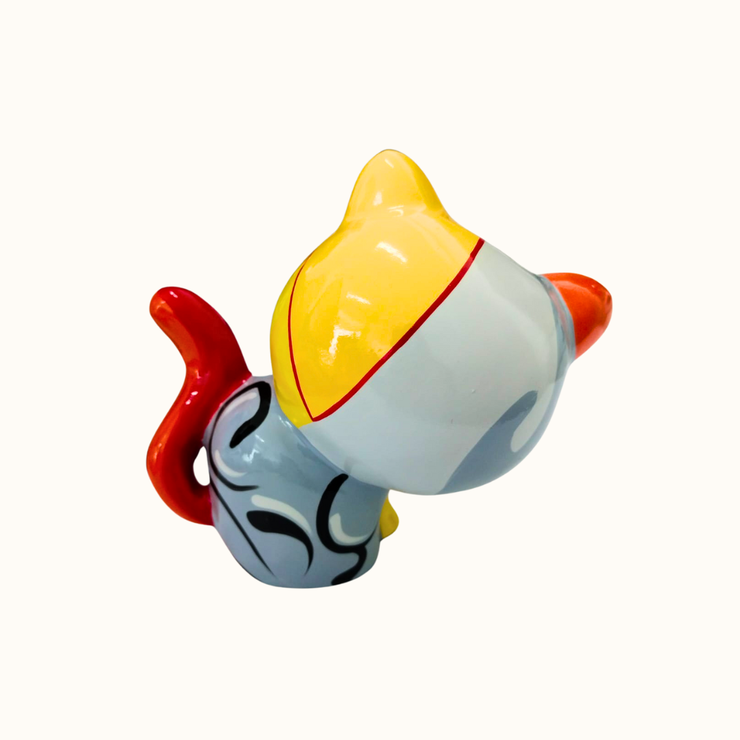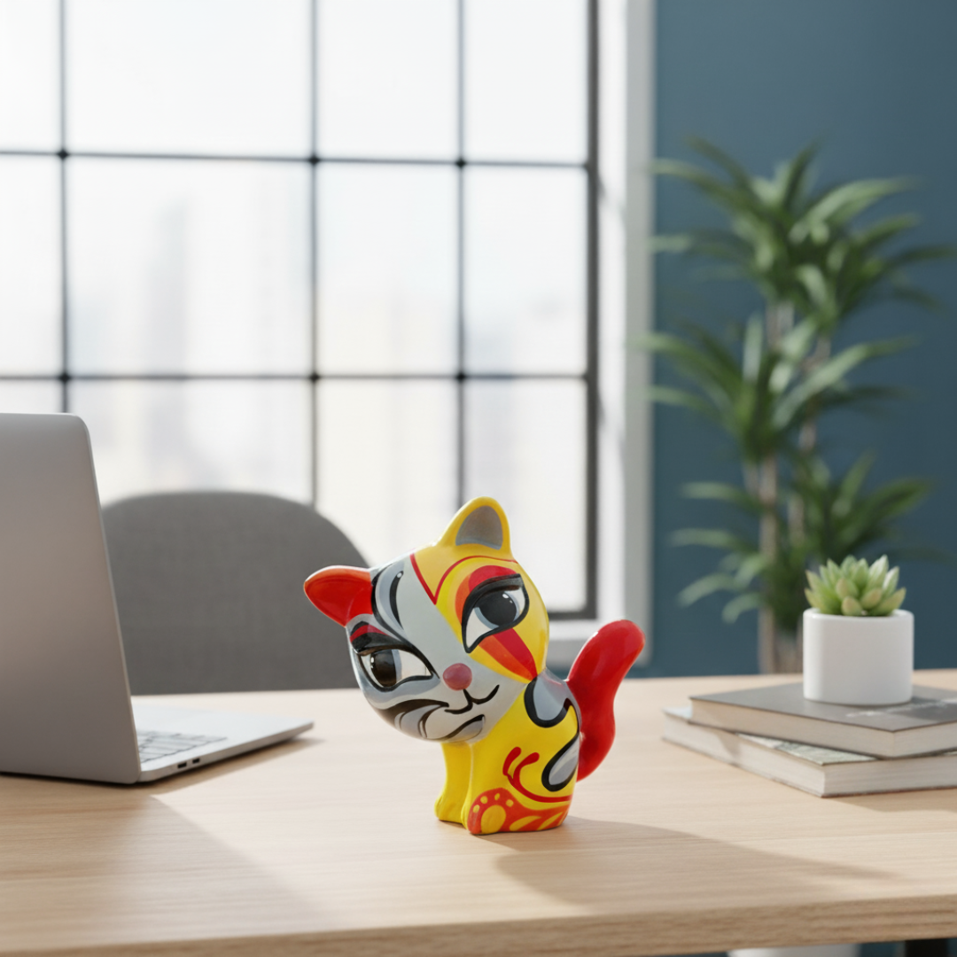 She’s not just a cat she’s a burst of fiesta energy, with eyes that gleam like secrets. Tisha brings playful charm to any corner, like a tiny guardian of joy who once danced through a painter’s dream. Let her perch on your shelf and watch your space come alive with color, curiosity, and quiet mischief.