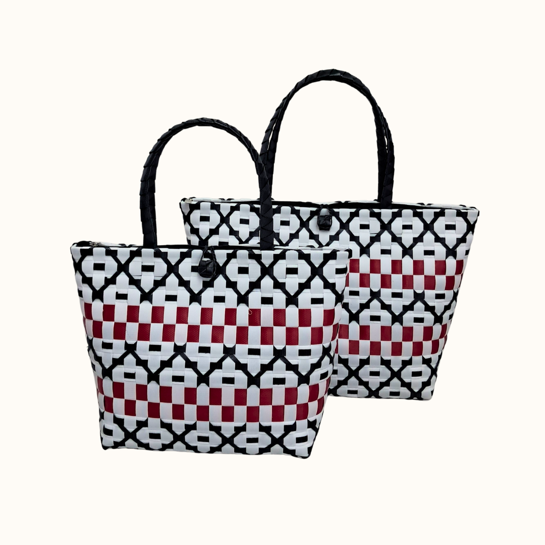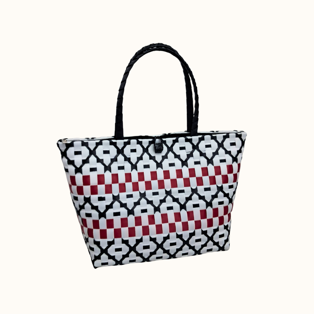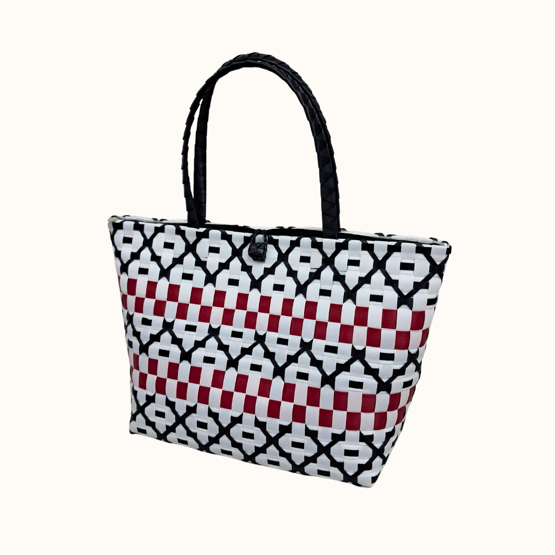 Ruwena doesn’t whisper it declares. With its bold red center framed by black-and-white diamonds, this woven piece feels like a confident stride through a crowded room, turning heads without trying. The texture is unapologetically tactile, the kind you reach for instinctively—rugged, rhythmic, and ready to be yours.