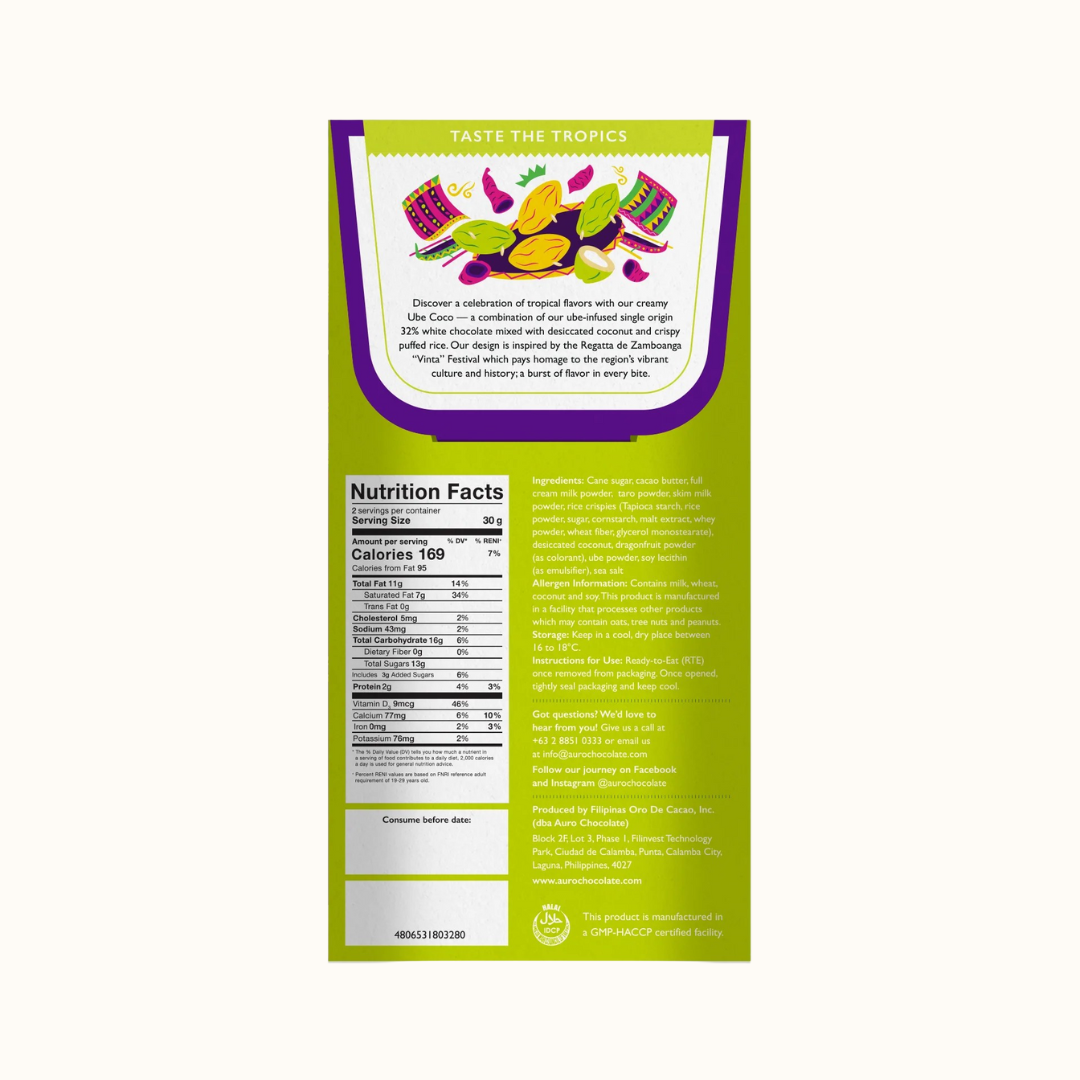 Discover a celebration of tropical flavors with our rich and creamy Ube Coco — a combination of our ube-infused single origin 32% white chocolate mixed with desiccated coconut and crispy puffed rice. Our design is inspired by the Regatta de Zamboanga 'Vinta" Festival which pays homage to the region's vibrant culture and history, a burst of flavor in every bite.