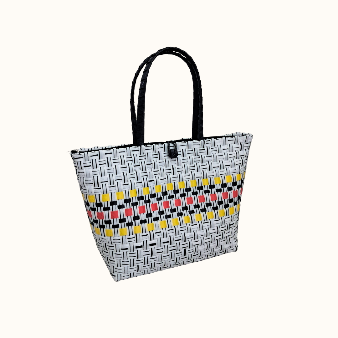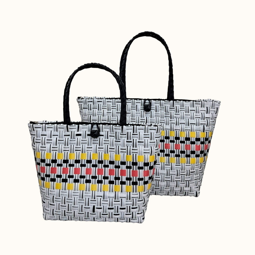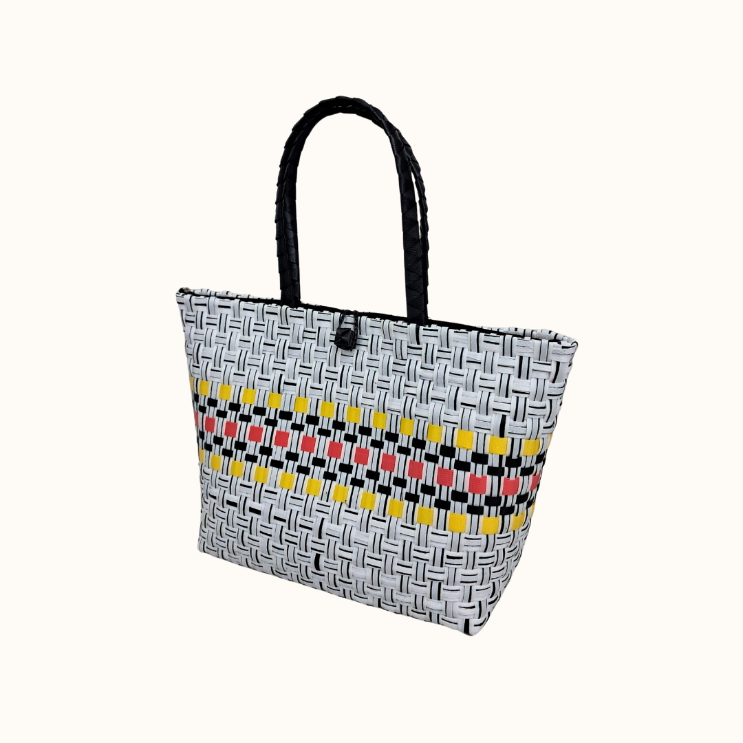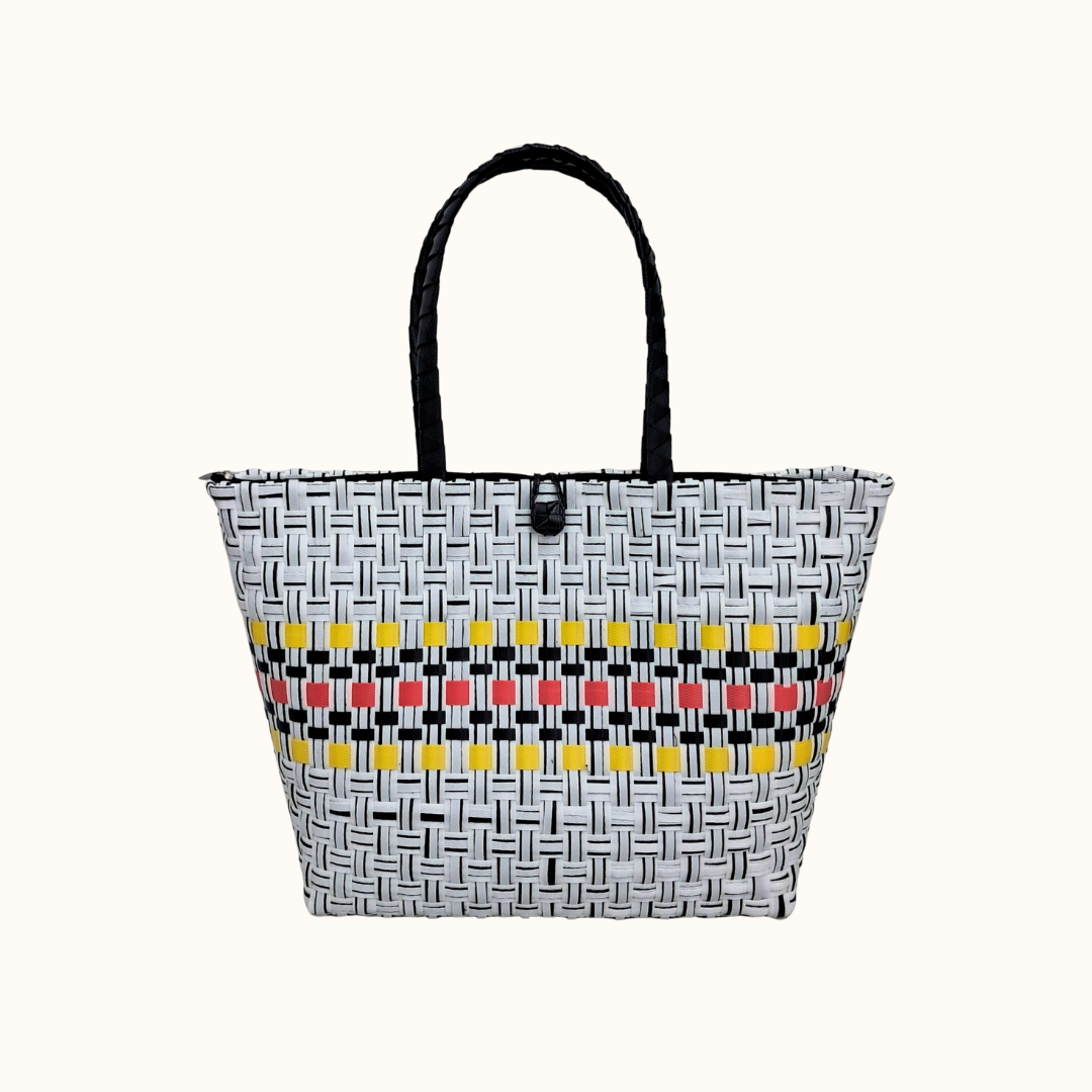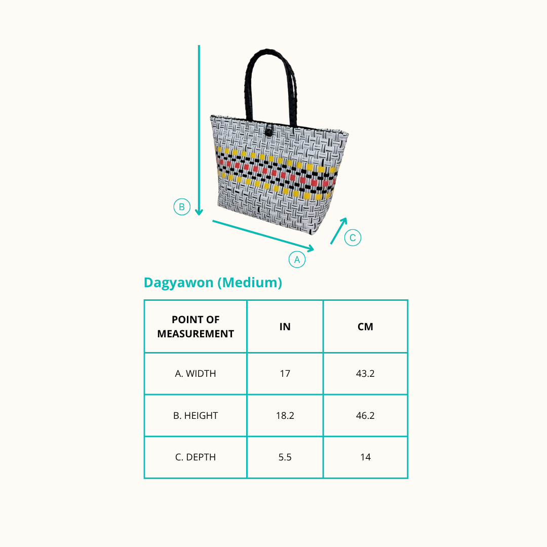 Dagyawon carries the pulse of community—its vibrant band of red, yellow, and black blocks woven into a crisp white grid feels like many hands working in harmony. The braided black handles and button clasp add structure to its story, making it perfect for days filled with movement, purpose, and shared joy. It’s a bag born of bayanihan—meant to be seen, used, and remembered.
